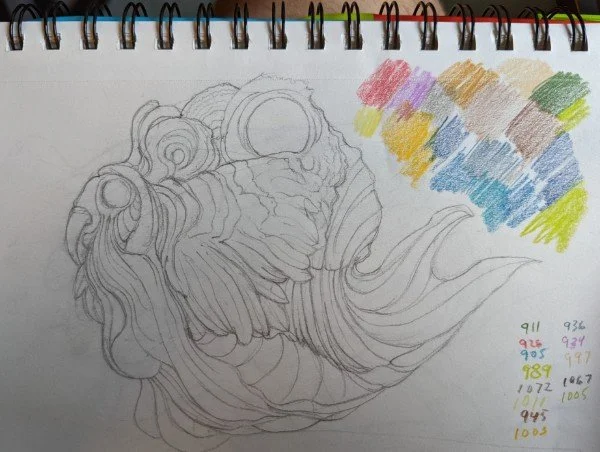 I’d been carrying around a really small sketchbook, furiously sketching ideas for the upcoming show. My wife was pregnant with our child for most of the time I was working on the show, so I was doing a lot of caregiving, making sure she had what she needed. We traveled a lot during that time, too, with doctor appointments in NYC and Dallas as we transitioned back to Arkansas. So, I needed to be able to sketch in 15-minute increments in waiting rooms and in the car or the plane.