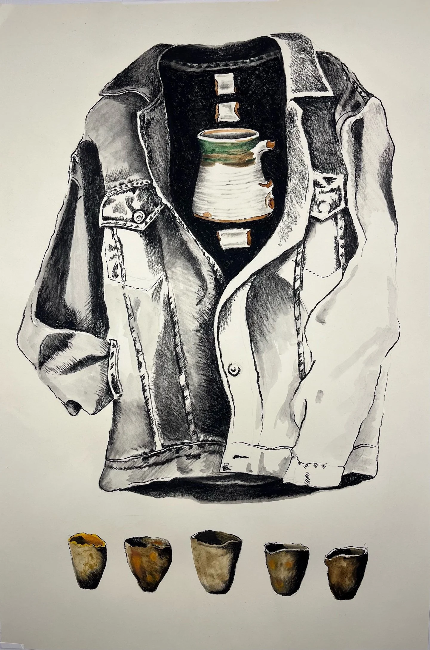 Helen’s cup, depicted here, is the cup I was just talking about. I put it inside a coat as a way to protect it from being broken further, which is a possibility because I use it weekly. The drawing also works to keep Helen’s memory alive. She was a well-known Arkansas artist and teacher.