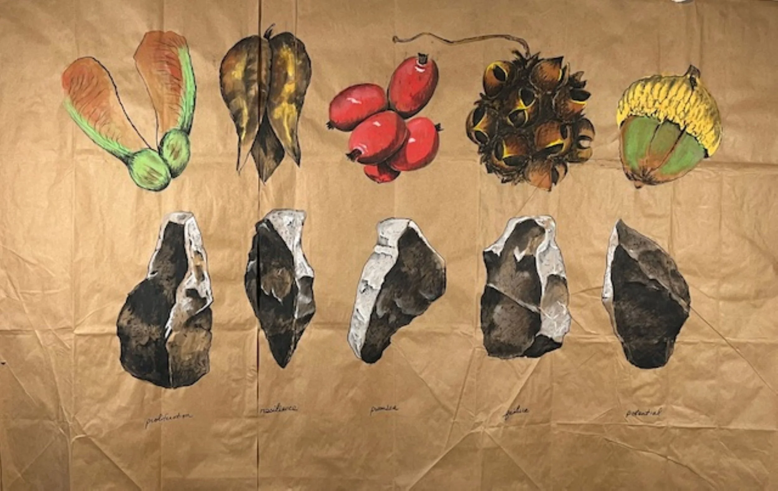 Seed Pods: Persistence, charcoal, pastel, and handmade sandstone paint on an opened lawn leaf bag, 36” x 72”