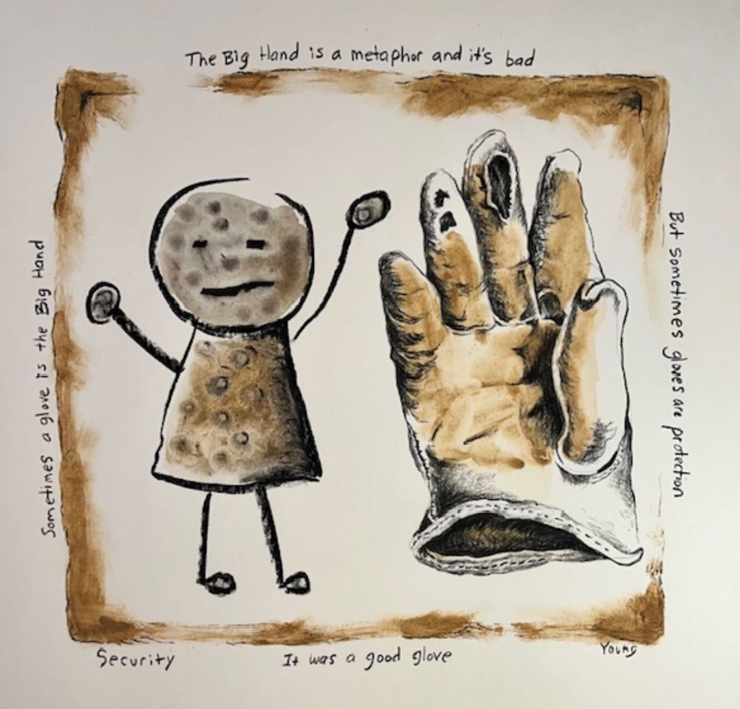 JY: A few years ago, I decided to re-purpose the visual metaphor of the glove and use them as metaphors for protection. So, I guess, sometimes gloves can be the Big Hand, and sometimes they can be a coat.