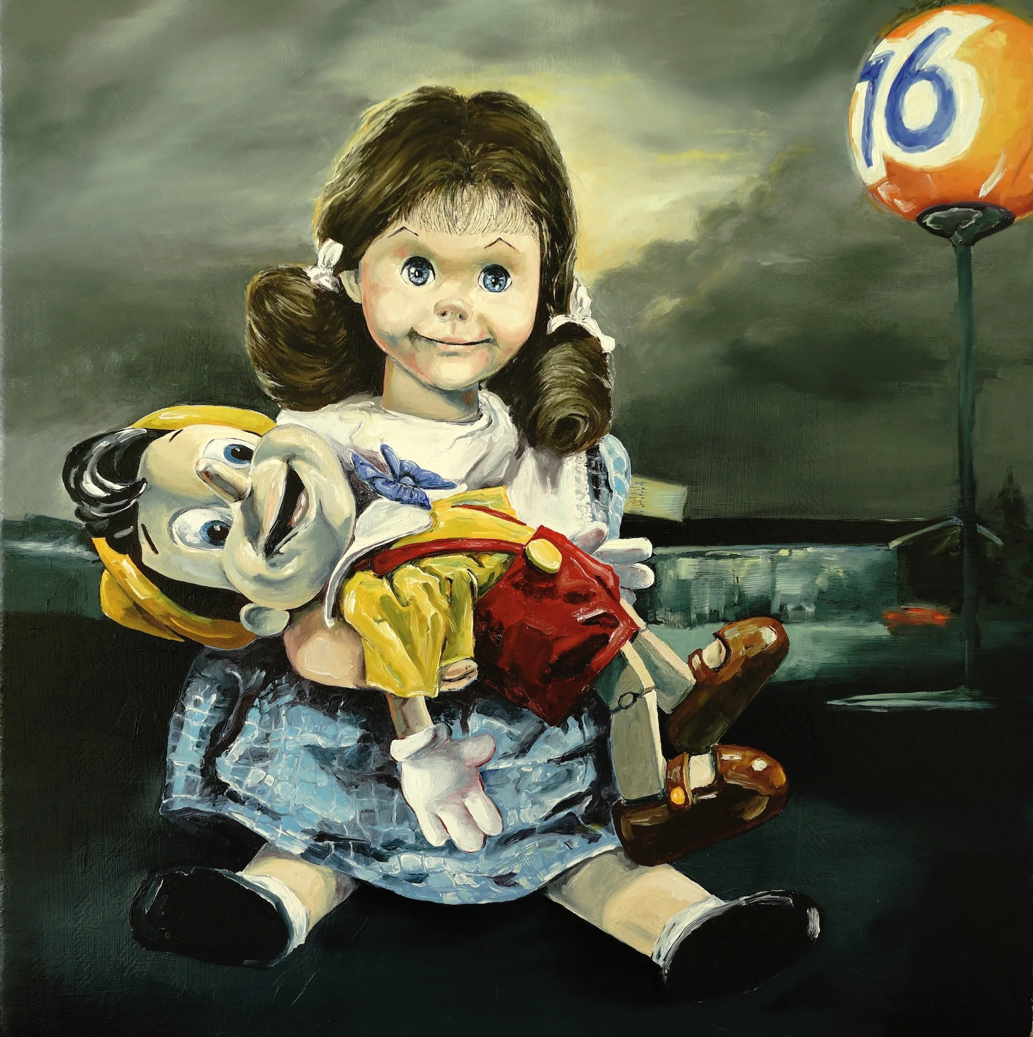 TS: This painting brings together several of my earliest childhood fascinations in one composition. It reimagines Michelangelo's Pietà, substituting the Virgin Mary and Christ with two iconic figures from my youth: the sinister Talky Tina from The Twilight Zone and Pinocchio.