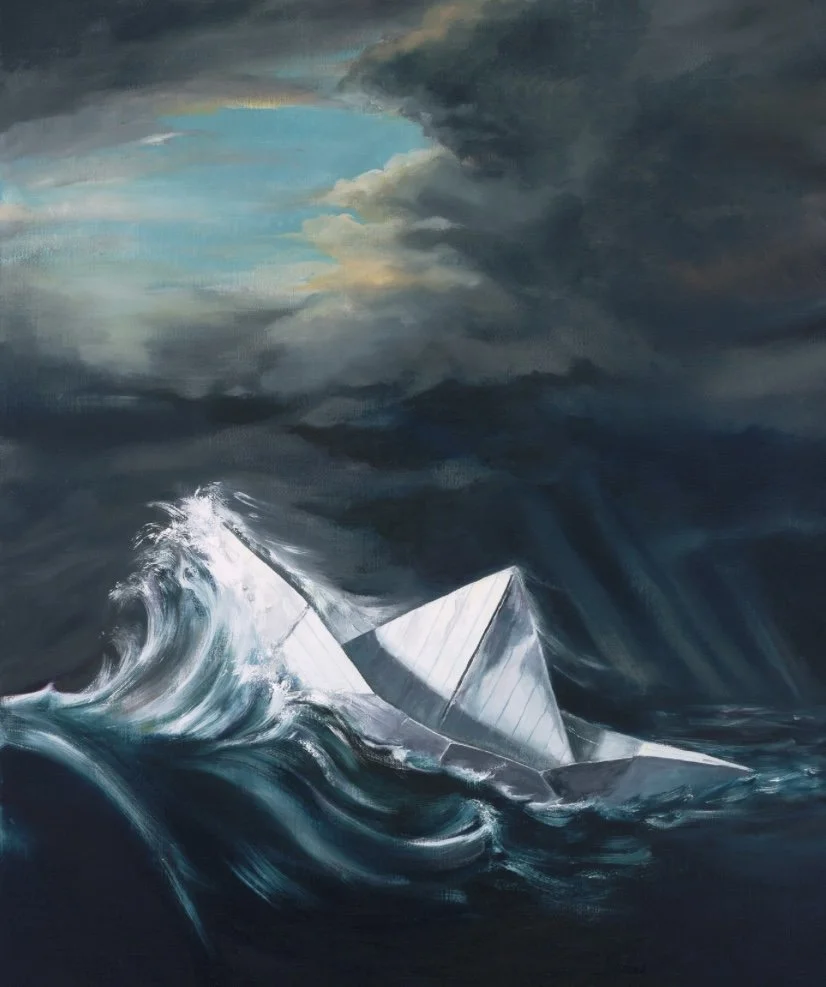The painting actually weaves together several visual touchstones from my childhood - Rembrandt's stormy Sea of Galilee, the powerful curves of Hokusai's Great Wave, and even Sendak's magical journey in Where the Wild Things Are. There's that beautiful moment when Max sails away to where the wild things roam - that sense of childhood possibility, when every folded paper boat could actually carry you to some extraordinary place. My work often returns to that adolescent sense of wonder, when the world still felt full of undiscovered places and unlimited potential.