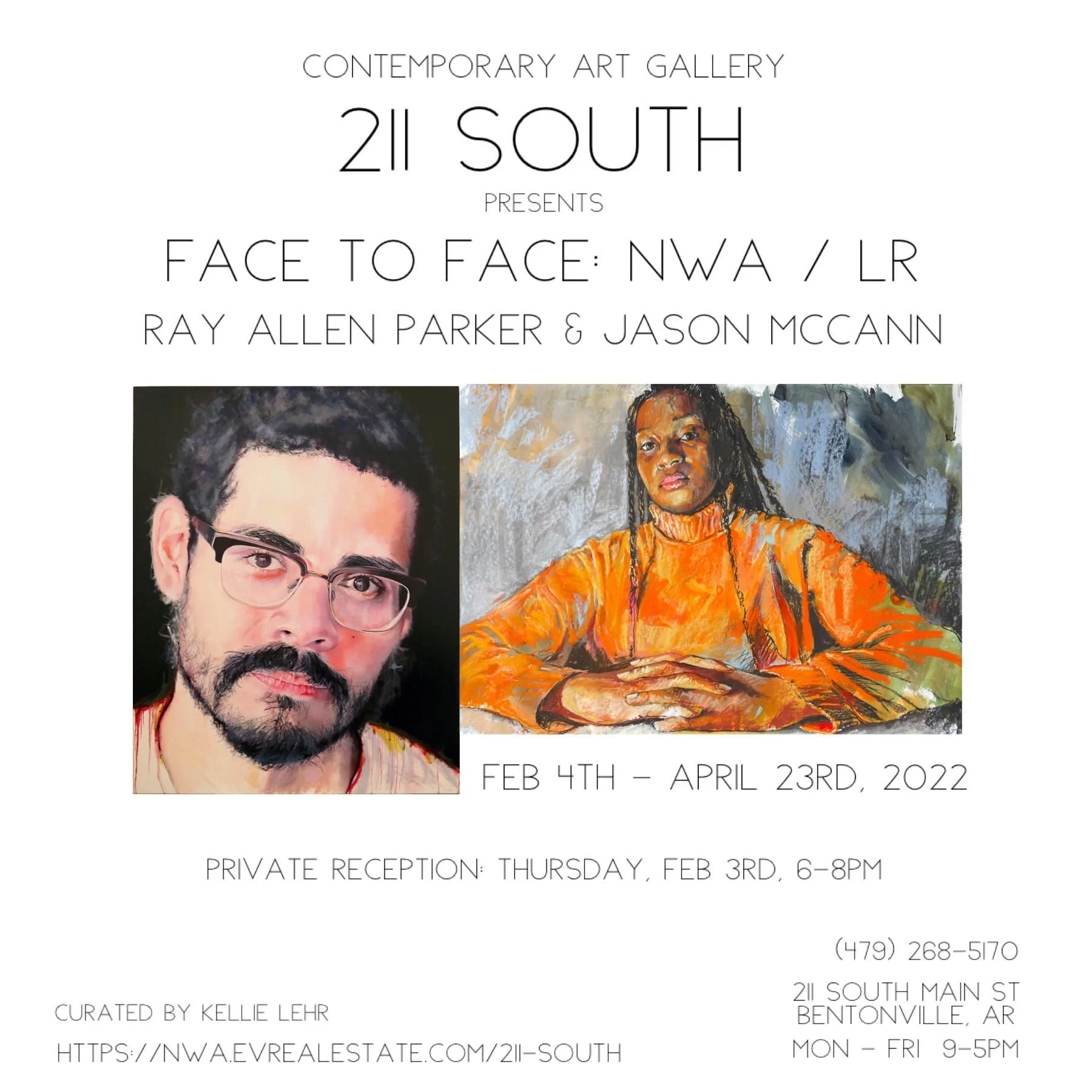 211 South presents Face To Face: NWA/LR, paintings made in 2021 by Ray Allen Parker and Jason McCann. Curated by Kellie Lehr, the exhibition is free and open to the public from February 4th through April 23rd, 2022.
